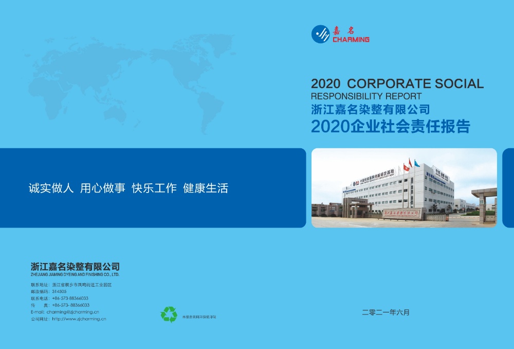 《浙江嘉名控股有限公司2020企業(yè)社會責任報告》本著客觀、透明、誠信、規(guī)范的原則編寫,從責任管理、誠信建設、價值創(chuàng)造、綠色環(huán)保、安全生產、垃圾分類、員工權益、黨群工作、企業(yè)文化、社會公益等責任和行動出發(fā),以豐富的內容、翔實的數(shù)據(jù)和真實的業(yè)績,全面展示了2019-2020年公司打造實力嘉名、創(chuàng)新嘉名、誠信嘉名、綠色嘉名、和諧嘉名的實踐情況,彰顯了公司為早日實現(xiàn)“致力成為國內外知名服裝品牌的首選面料供應商”的嘉名夢的信心和決心,更向社會公眾呈現(xiàn)了嘉名作為一家民營企業(yè)為履行社會責任,推動行業(yè)和當?shù)厣鐣目沙掷m(xù)發(fā)展所做出的努力及責任擔當。