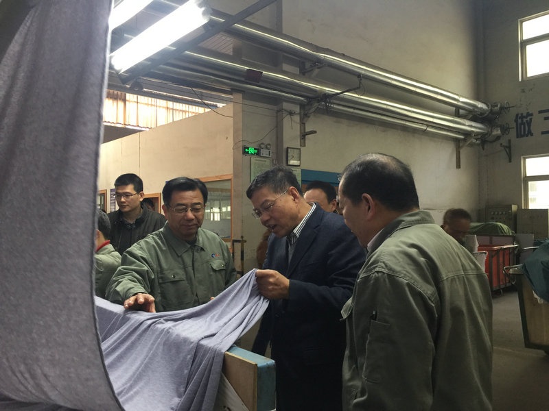 徐紀平副秘書長等領導到染部車間現場,實地察看了公司生產現場,向公司領導了解了公司今年經營情況和轉型升級工作。莫總向調研組領導介紹了公司基本情況和近年來公司推進轉型升級工作,特別是今年實施的淘汰落后產能實施智能化生產技改項目。調研組領導在車間里仔細察看了公司引進的意大利貝利尼公司生產的超低浴比溢流多功能生態勻染染色機,以及中央控制室,染料助劑自動化輸送系統,對公司實施智能化生產技改的轉型升級舉措給予高度肯定,鼓勵公司領導進一步通過轉型升級,推動企業向信息化、自動化、智能化方向發展,實現節能減排,減員增效,提高企業競爭力,促進傳統企業的新發展。